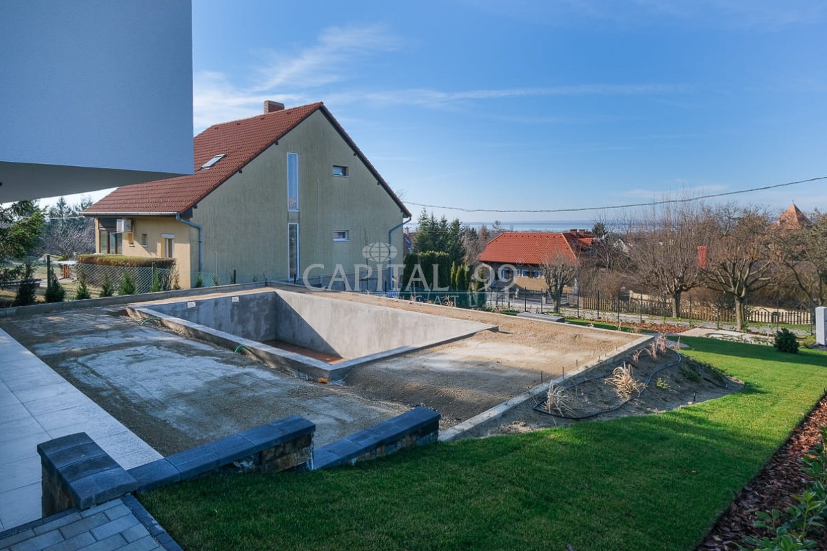 code number: 4278Vrijstaande woning in aanbouw met panoramisch uitzicht op het Balatonmeer in een rustige, stille zijstraat in Gyenesdiás staat te koop. De woning is voor 90% bouwrijp. De vermelde verkoopprijs heeft betrekking op de volledig gebouwde woning, volledig ingericht, met tuin en zwembad. De energie wordt geleverd door een hoogrendement lucht-water warmtepomp. De woning wordt verwarmd en gekoeld en het warmwater wordt geproduceerd via de warmtepomp. In het stookseizoen biedt de energieleverancier lagere kosten via het H-tarief, waardoor de warmtepomp kosteneffectief kan worden gebruikt. De woning is voorbereid op een zonnesysteem (bedrading, stopcontacten), mocht de nieuwe eigenaar er een willen inbouwen. Er wordt een gecombineerd verwarmings- en koelsysteem (vloerverwarming, vloerverwarming bij de ramen, fancoilsysteem) ingebouwd. De moderne, energiezuinige ramen worden voorzien van elektrische radiatoren. In de tuin wordt een overdekt, verwarmbaar zwembad van 8x4 m aangelegd. Het perceel wordt omheind en voorzien van gazon en een haag. Er wordt ook een irrigatiesysteem aangelegd.